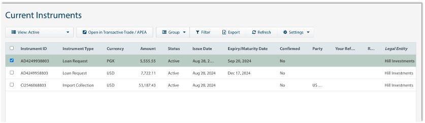 | Open with Transactive Trade / APEA | Open the selected transaction in ANZ Transactive Trade / APEA in a new tab without the need for you to login again. |