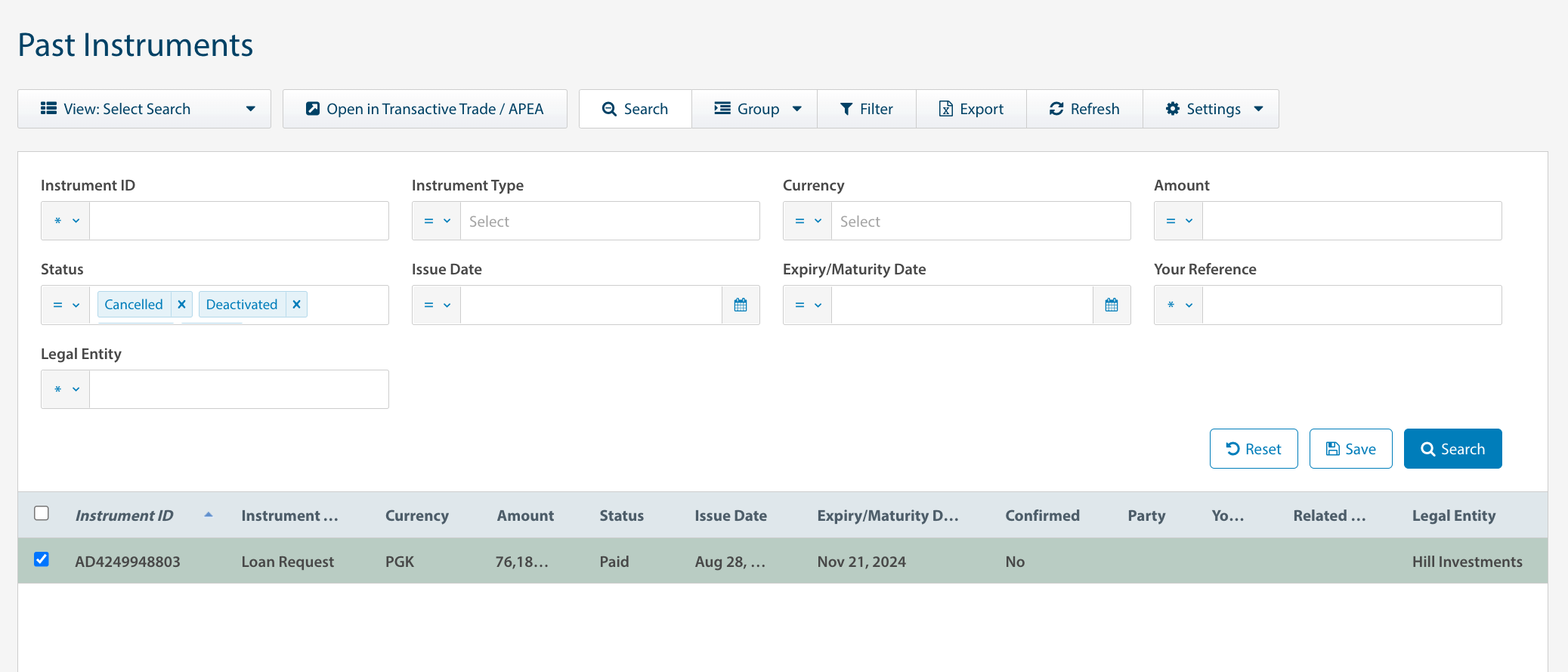 This screen allows you to perform a search for instruments that are in a Cancelled, Closed, Deactivated or Paid status.