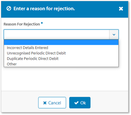 Pilih alasan untuk menolak debit langsung berkala dari daftar drop-down atau pilih Lainnya dan masukkan alasan, lalu klik Oke.