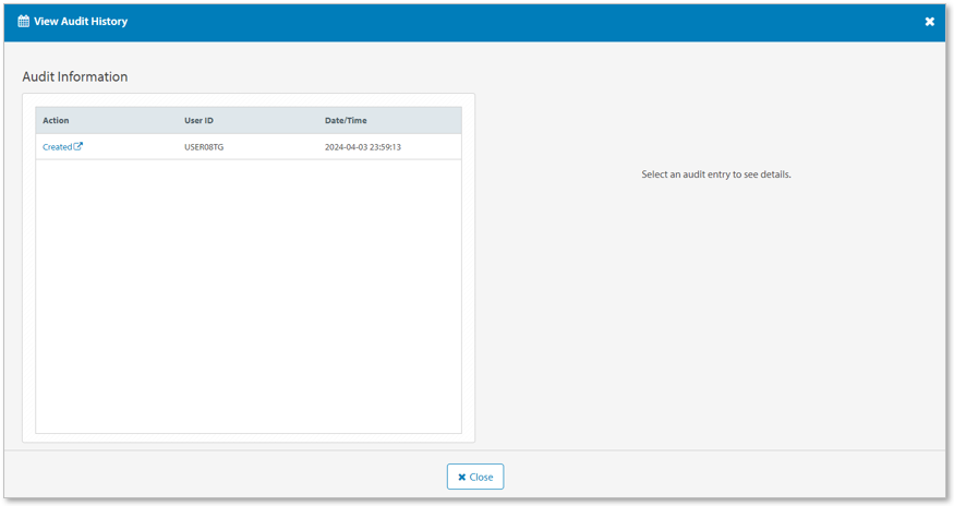 「監査履歴の表示」ポップアップウィンドウが表示され、管理者が承認パネルに対して実行したアクションが表示されます。アクションのハイパーリンクをクリックすると、イベント履歴情報が表示されます。