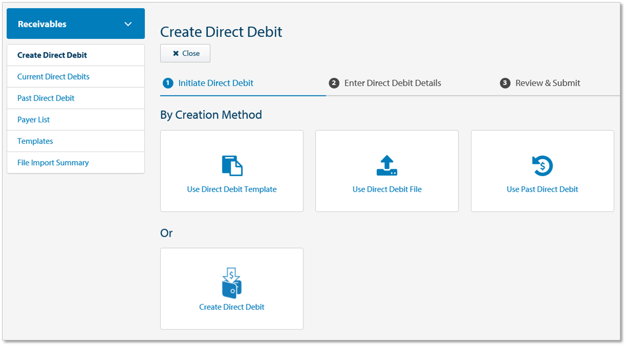 「直接引き落とし作成」画面では、直接引き落としを作成するために使用できる方法が提供されます。