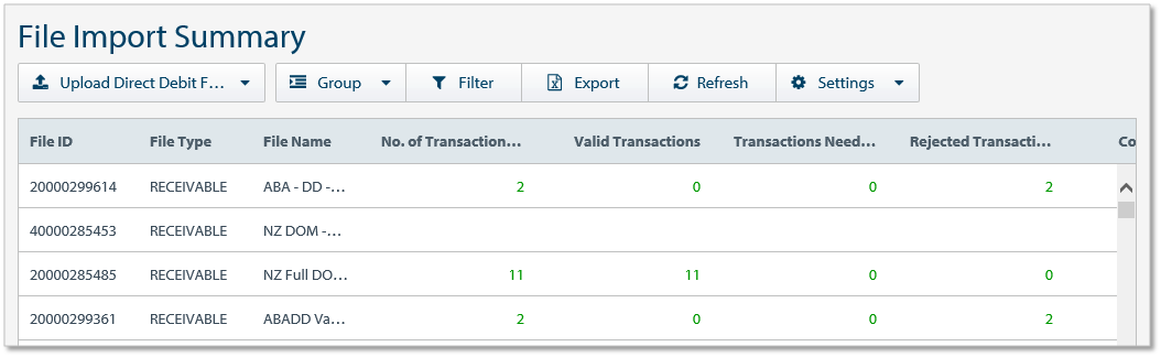 | 拒否されたトランザクション | 拒否されたファイル内のトランザクション数。 |