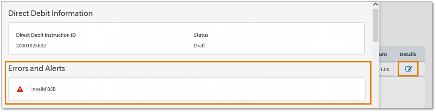 **支払者口座振替詳細**をクリックして、支払者口座振替詳細ポップアップウィンドウでエラーを表示します。