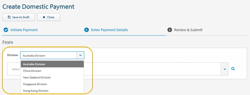 支払い/直接引き落としの作成 - ユーザーは、支払い/直接引き落としの作成手順中に、ANZ Transactive - Globalで必要なディビジョンを選択できます。
