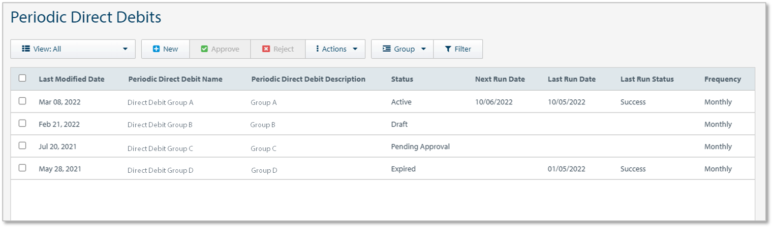| アクション | 選択した1つまたは複数の定期自動引き落としに対してアクションを実行するには、「アクション」メニューを使用します。表示、編集、承認、却下、または削除 |