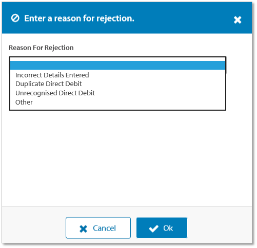 Chọn lý do từ chối (các) khoản ghi nợ trực tiếp từ danh sách thả xuống hoặc chọn Khác và nhập lý do, sau đó Nhấp vào Ok.